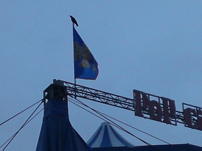 昨日の公演終了後の黄昏時社旗のてっぺんで羽を休める