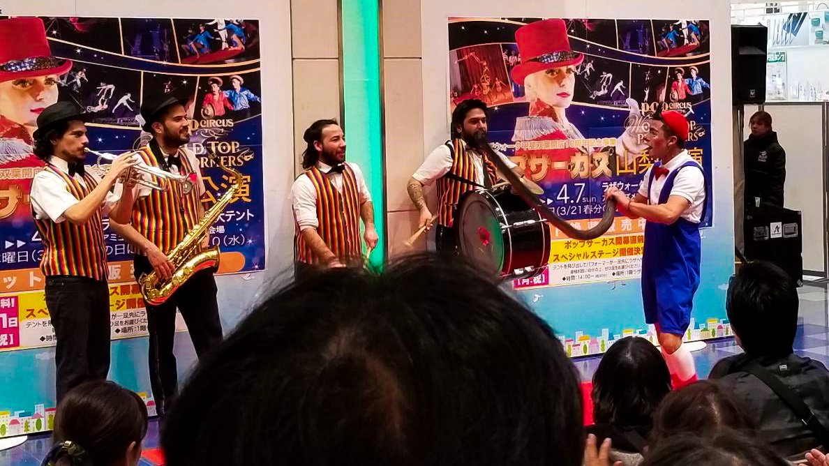 ワクワク・ドキドキ♪トップの出番はポップサーカスではお馴染み「アンコールバンド」の登場!!この軽快な音楽に誘われて…クラウン キキンが登場!?ポップサーカスのNEWメンバーとなったアーティストのひとり、キキンの登場にイベントにお越しいただいたお客さんは、驚き+笑いで会場を「サーカスムード」に最後はポーズでフィニッシュ!そして会場を驚きの声で沸かせたのは「ハンドtoハンド」の二人