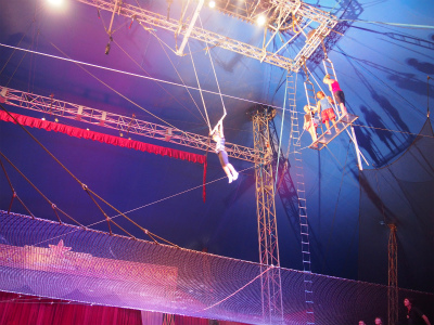 一人ずつ順番にブランコに掴まって空中ブランコを体験、